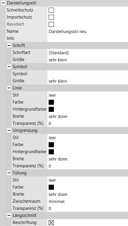 Wählen Sie über das Hauptmenü “Umgebung > Definition > Darstellungsstil neu…” einen neuen Darstellungsstil. Es erscheint ein Abfragefenster. Vergeben Sie bitte einen Namen für den Darstellungsstil eines bestimmten Fachobjekts. Rechts erscheint die Box mit allen möglichen Stileigenschaften, die eingestellt werden müssen. Je nach Maßstab beim Export wird die Schriftgröße automatisch angepasst. Auf diese Art und Weise erstellen Sie konkrete Darstellungsstile für alle Fachobjekte, die im Projekt vorkommen. Diese Stile können sortiert in Unterordnern verwaltet werden.