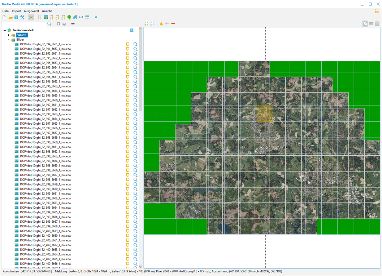 - Nach dem Einfügen der Bilddaten sehen Sie im linken Bereich die angemeldeten Dateien und im rechten Bereich eine 2D-Ansicht des Geländemodells.