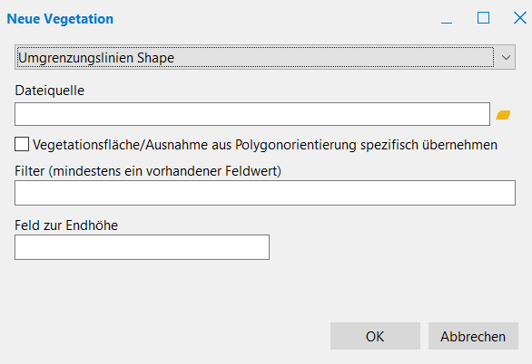 Auf die gleiche Art und Weise können Sie in die jeweilige Vegetationsgruppe eine Datei mit Ausnahmeflächen importieren. Solche Flächen können dann genutzt werden, wenn sie ohne Vegetation dargestellt werden sollen (z.B. Straßen). Über die Einstellungen solcher Dateien mit Ausnahmeflächen können Sie hier nachlesen.