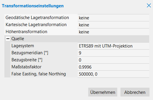 Für den Import einer Shape-Datei wählen Sie im Hauptmenü “Import > Vegetation hinzufügen…” (alternativ über den Button “Eine neue Vegetationsgruppe bzw. ein neues Vegetationsobjekt anmelden oder erstellen…”). Es öffnet sich das Dialogfenster der Transformationseinstellungen.
