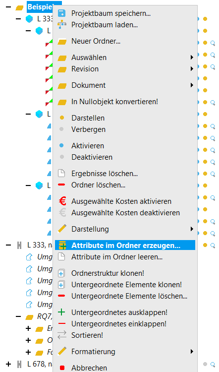- Oder Sie können den übergeordneten Ordner markieren und über das Kontextmenü die Option “Attribute im Ordner erzeugen!” auswählen.