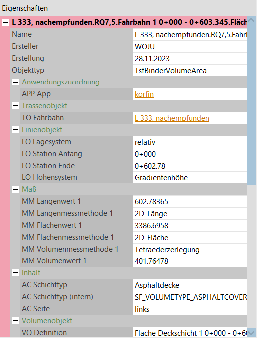 - Wenn Sie Ihr KorFin®-Projekt aktualisieren, werden die neu hinzugefügten Attribute im rechten Eigenschaftsbereich angezeigt. Um die hinzugefügten Attribute von den Bestehenden zu unterscheiden, werden diese mit roter Schrift in KorFin® dargestellt.