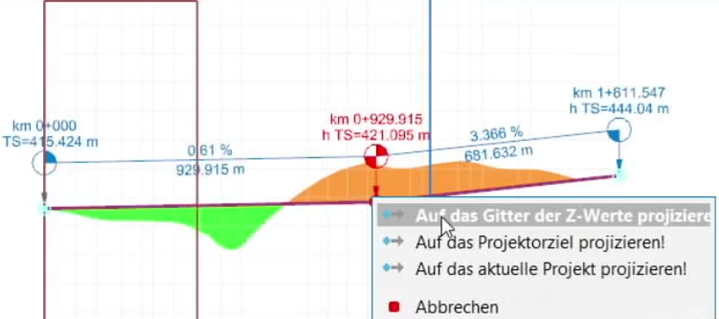 Die Stationspunkte können manuell an das Höhenmodell oder jeder einzeln über die Option “Auf das Gitter der Z-Werte projizieren” (Rechtsklick -> Kontextmenü) angepasst werden.