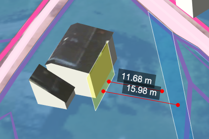 Zusätzlich haben Sie die Möglichkeit, ausgehend von einer Bezugsebene Abstände zu anderen Objekten oder anderen Ebenen lotrecht zu messen. Dazu aktivieren Sie die Option “Orthogonal bezüglich einer Ebene messen” und wählen eine Bezugsebene aus. Diese Ebene wird gelb markiert. Nun können Sie Abstände zu den auf anderen Objekten bzw. Ebenen abgesetzten Punkten messen.