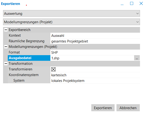 Exportieren Sie die beim Anlegen der Konstruktionslinie entstandenen Umgrenzungen, insbesondere die Einschnittsumgrenzung über “Exportieren > Auswertung > Modellumgrenzungen (Projekt)” (z.B. als Shape-Daten).