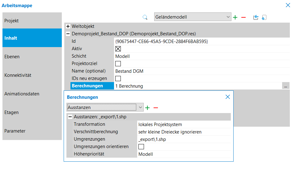 Dazu öffnen Sie die Arbeitsmappe über “Arbeitsmappe bearbeiten” und klicken im Reiter “Inhalt” im angemeldeten Geländemodell unter Berechnungen auf … . Es erscheint ein separates Fenster zur Einstellung der Operation.