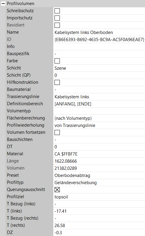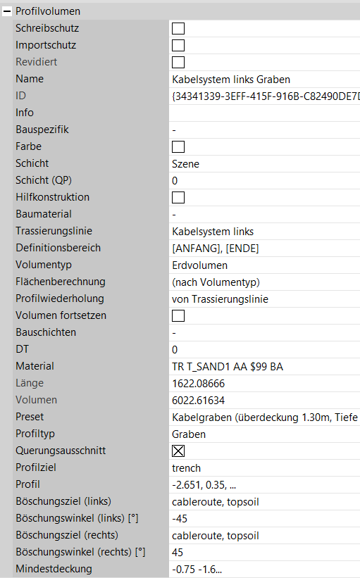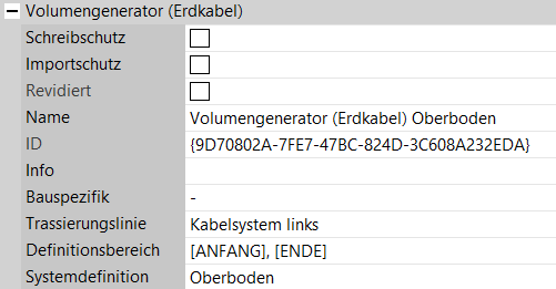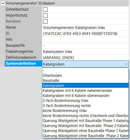 Soll(en) Ihr(e) Erdkabelsystem(e) keine einfache Linie bleiben, sondern einen Volumenkörper mit weiteren verknüpften Informationen darstellen (z.B. Kabelgraben, Haufwerke, Baustraßen etc.), definieren Sie die betreffende Eigenschaft folgendermaßen: