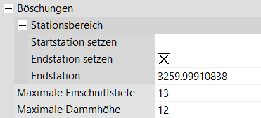 Maximale Dammhöhe | Maximale Höhendifferenz zwischen der Oberfläche des Verkehrswegs und der Oberfläche am Anschlusspunkt der Böschung. Wird die Differenz überschritten, werden Brückenbauwerke platziert. |