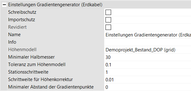 Höhe | Die Höhe von Kabelsystemlinien wird über einen Gradientengenerator definiert. Die Grundlage des Gradientengenerators ist das zugrundeliegende Geländemodell. Basierend auf diesem wird anschließend mit den gegebenen Parametern eine Gradiente entlang des Geländemodells generiert. Diese Gradientengenerierung kann mit weiteren Fachobjekten parametrisch abgeändert werden. | |