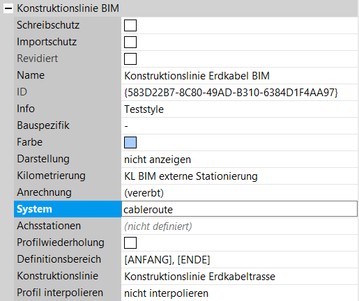 Die Grundlage für die Trassierungslinien der Kabelsysteme bilden andere Trassierungslinien. In der Regel wird als Grundlage eine Konstruktionslinie vom Linientyp “Erdkabel” und Linienart “klassische Achse mit einer Gradiente” verwendet (siehe Erstellung der Konstruktionslinie für die Erdkabeltrasse). Um die Konstruktionslinie im BIM-System verwenden zu können, muss eine BIM-Konstruktionslinie erstellt werden.
