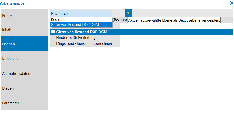 - Wenn Sie Ihr Vermessungsmodell mit dem Gitter der Z-Werte als Grundlage für Ihre Berechnungen im Projekt verwenden möchten, so haben Sie die Möglichkeit, dieses Modell (soll bereits angemeldet sein) alternativ über die Auswahl “Gitter von (Name des Modells)” hinzuzufügen. - Anschließend markieren Sie die hinzugefügte Ebene als Bezugsebene. Ab diesem Moment wird sie als Grundlage beim Berechnen von Schnitten und Höhenpunkten im Projekt verwendet (Details unter Integration einer Vermessung in ein Geländemodell in KorFin®).