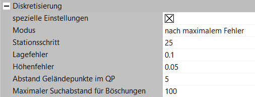 Abstand Geländepunkte im QP | Definition, wie die Geländelinie unter der Planung im ausgewählten Querprofil diskretisiert werden soll. Je kleiner der Abstand, desto genauer erfolgt die Mengenberechnung, desto höher ist der Berechnungsaufwand. | ||