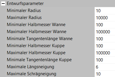 Entwurfsparameter (für ![]() | Bereich der Radien, für die im Lageplan betrachtete Konstruktionslinie beziehungsweise der Krümmungskreisradien, für die im Verlauf der Z-Werte betrachtete Konstruktionslinie, getrennt nach positiven und negativen Krümmungen (Wannen, Kuppen). | ||