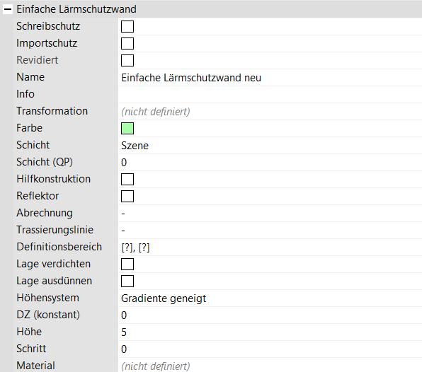 Die “Materialangabe” bestimmt eine Textur bzw. Farbe der neuen Lärmschutzwand (z.B. N L Z CA $008000).