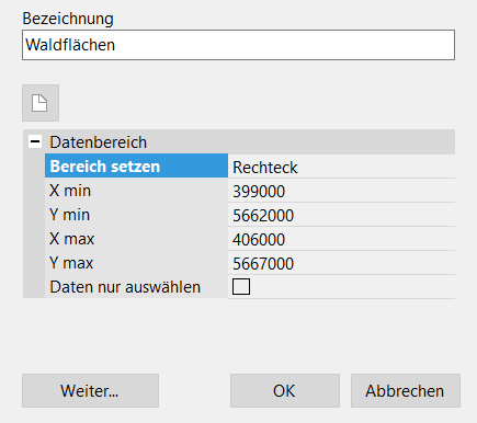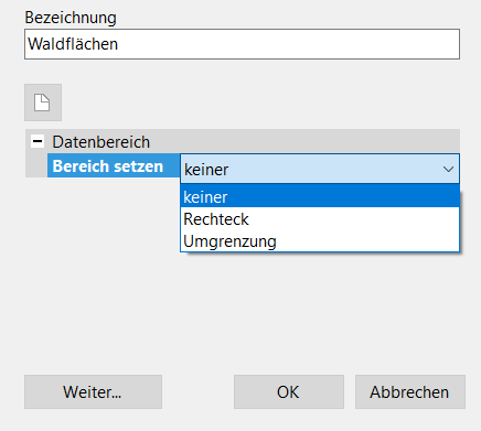 Diese Bereiche können Sie bearbeiten. Mit der Auswahl “Rechteck” können Sie mithilfe von Koordinaten gütige Bereiche einstellen bzw. mit der Auswahl “Umgrenzung” - Umgrenzungsbereiche importieren.