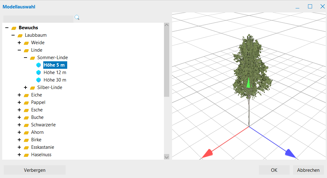 Über … gelangen Sie in die “Modellauswahl” zum Einstellen der definierten Vegetationstypen und Jahreszeitendarstellungen (z.B. “Laubbaum > Linde > Sommer-Linde > Höhe 5 m”) und Anpassen deren Attribute (falls vorhanden).