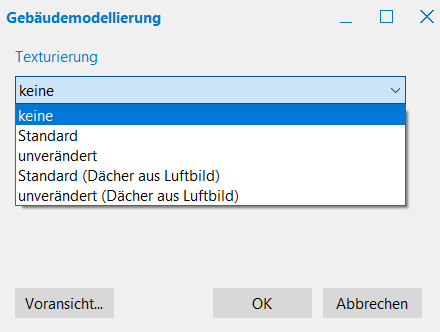 Mit “Weiter” öffnet sich ein neues Fenster “Gebäudemodellierung” mit dem Untertitel “Texturierung”.