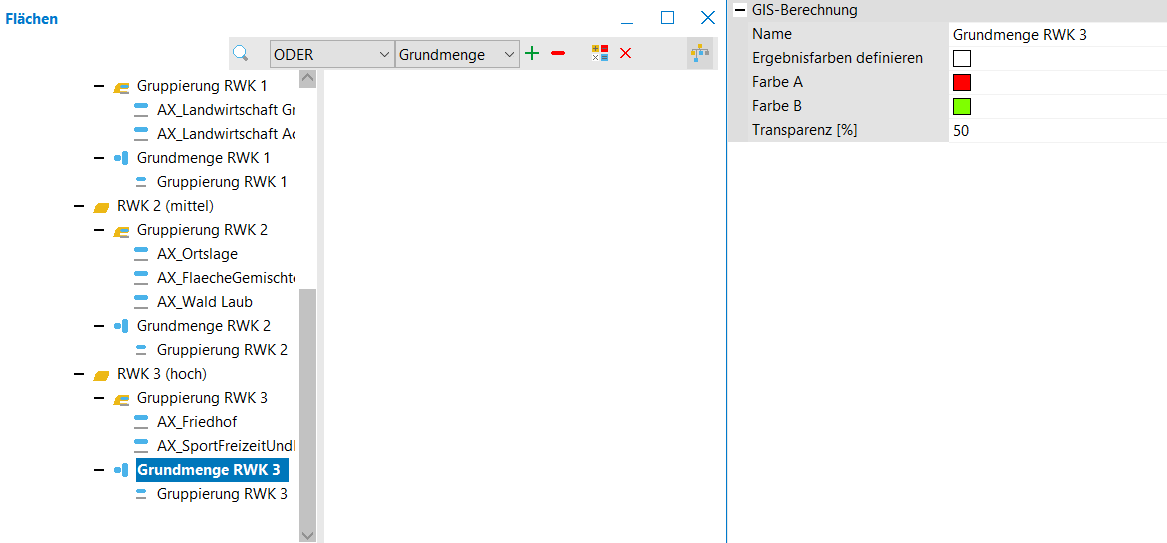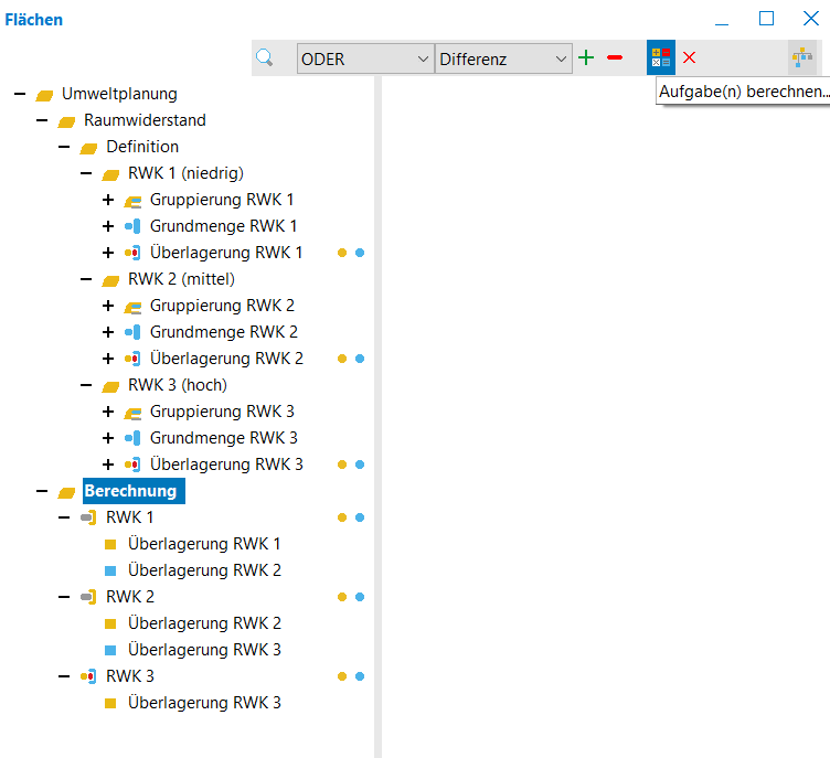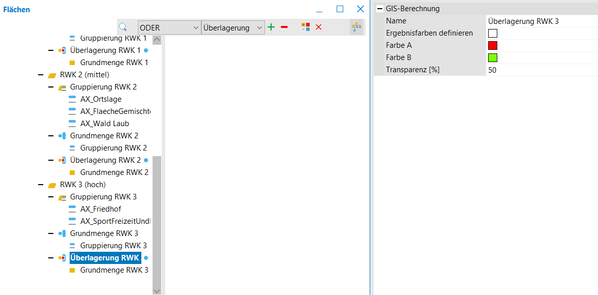 Da sich Flächen unterschiedlicher RWKs teilweise überlagern, aber immer die höchste RWK gilt, wird ab RWK Ib zusätzlich eine Differenz hinzugefügt. Diese dient dazu, Bereiche höherer RWKs von der jeweiligen RWK abzuschneiden. Die Funktionsweise ist dabei so, dass zunächst die Überlagerung der aktuellen RWK in der Differenz abgelegt wird. Alle daraufhin abgelegten Überlagerungen werden davon abgezogen. | |