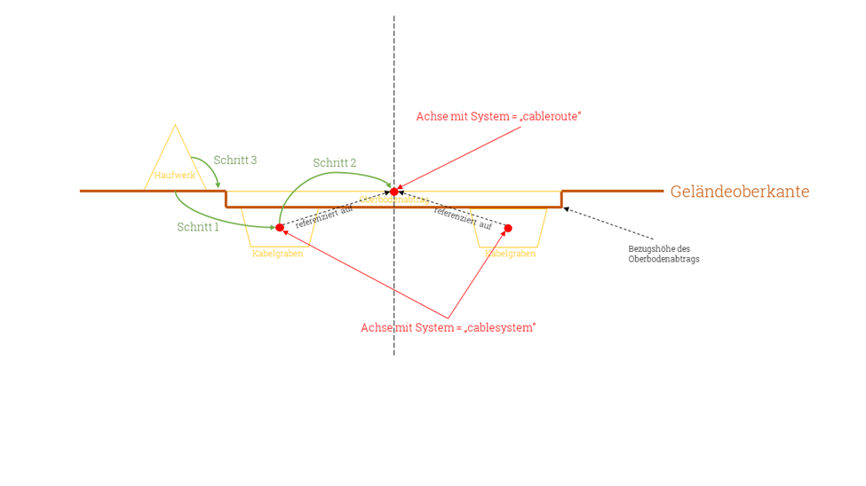 </volume>Das Haufwerk bezieht sich auf das System cableroute (system = "cableroute" im <right>- und <left>-Tag), d.h. das Profilvolumen vergleicht zuerst, ob das Volumenobjekt, auf das referenziert wird, eine cableroute ist. Wenn ja, dann wird überprüft, ob sich ein Volumen mit der Bezeichnung topsoil daran befindet. Wenn keine Übereinstimmung mit dem System vorliegt, dann wird an dem übergeordneten Volumenobjekt ein Vergleich vorgenommen. In diesem Fall besteht eine Übereinstimmung. Das line-Attribut der <left>- und <right>-Tags fragt nach topsoil. Im ersten Volumenobjekt enthält das line-Attribut des <target>-Tags topsoil als Wert. Somit besteht eine Übereinstimmung und es wird dieser Höhenbezug verwendet.