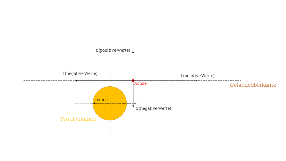 Es handelt sich um ein Leerrohr mit dem Durchmesser 28 cm (radius). Es wird um 14 cm nach unten (z) verschoben. Somit befindet sich die Oberkante des Leerrohrs auf der Höhe der Gradiente. Das Attribut countgibt an, mit wie vielen Stützpunkten das Kreisprofil diskretisiert wird.
