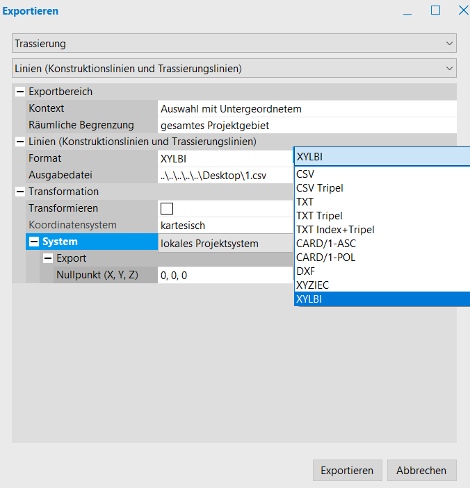 Je nachdem, welchen Projektbereich Sie beim Export erfassen möchten, wählen Sie die entsprechende Option aus.