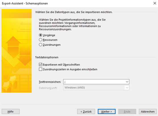 Wählen Sie das MS Project CSV-Schema aus und öffnen Sie anschließend die exportierte CSV-Datei.