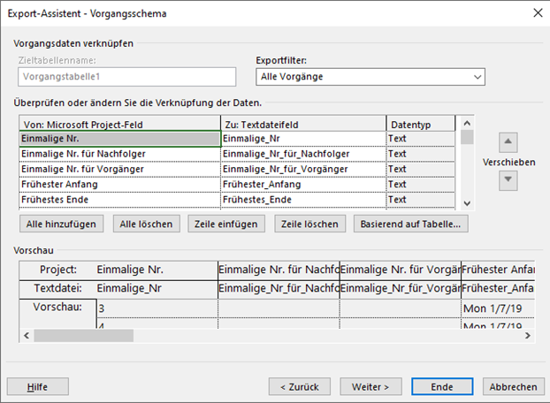 Anschließend exportieren Sie die Daten mit dem vorhandenen Schema.