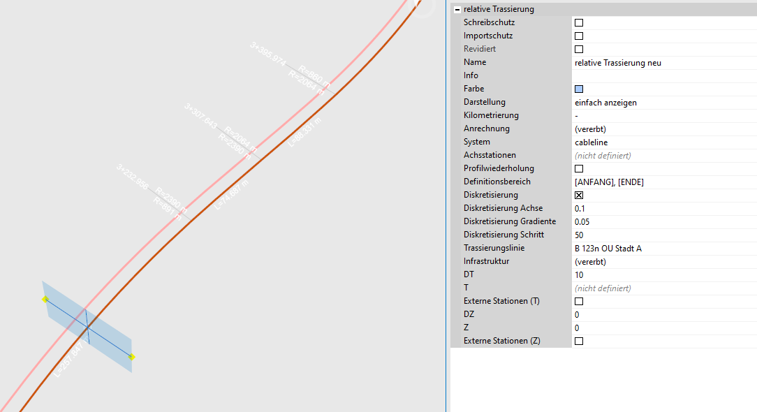 Für eine relative Trassierung ist eine Trassierungsachse Voraussetzung. Mit der Auswahl der Bezugstrassierungslinie im rechten Eigenschaftsbereich wird eine Verknüpfung zwischen der Trassierungslinie und der relativen Trassierung hergestellt. Es werden alle Trassierungselemente / Stationen usw. übernommen.