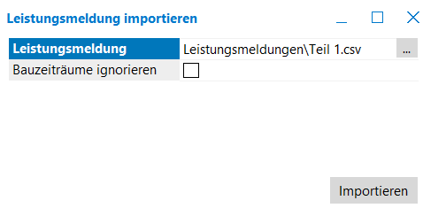 Importieren Sie die ausgefüllte initiale CSV-Tabelle und anschließend die weitere(n) in diesen Ordner über “Bauen > Leistungsmeldungen aus CSV importieren…”.