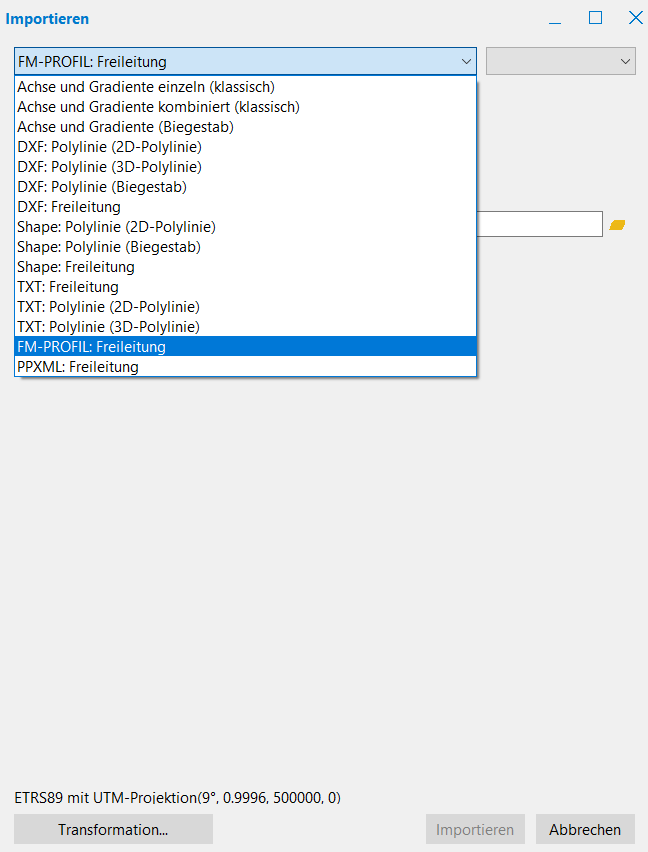 Wählen Sie im Menü “Infrastruktur > Trassierung” den Punkt “Konstruktionslinie(n) importieren”. Je nach Art Ihrer Importdaten haben Sie die Wahl zwischen verschiedenen Importen.