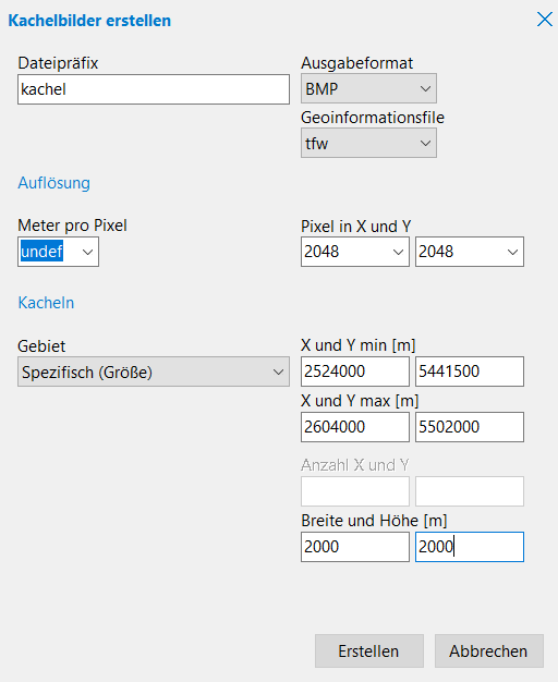 Da die Größe der Bilderkacheln geometrisch festgelegt ist, können Sie über eine Zielauflösung in die notwendige Pixelanzahl pro Bild umrechnen lassen. Demnach ergibt sich beispielsweise bei 0,2 Meter pro Pixel und einer Rasterbreite von 500 Meter eine Auflösung von 2500 Pixel. Darüber hinaus kann die Pixelanzahl auch direkt vorgegeben werden. Jedes Bild erhält dann genau diese Größe.