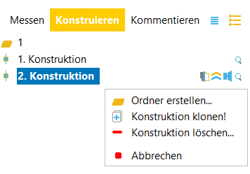 Konstruktion oder Ordner löschen | Je nachdem, was gerade ausgewählt ist, wird die Konstruktion oder der Ordner gelöscht. Nur leere Ordner können gelöscht werden. |