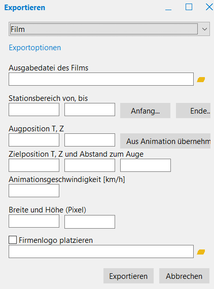 Mit dem Export “Film” wird eine Animationssequenz als AVI-Datei gespeichert. Dazu sind alle installierten Codecs des Windows®-Systems einsetzbar. Im Einzelnen legen Sie folgende Optionen fest: