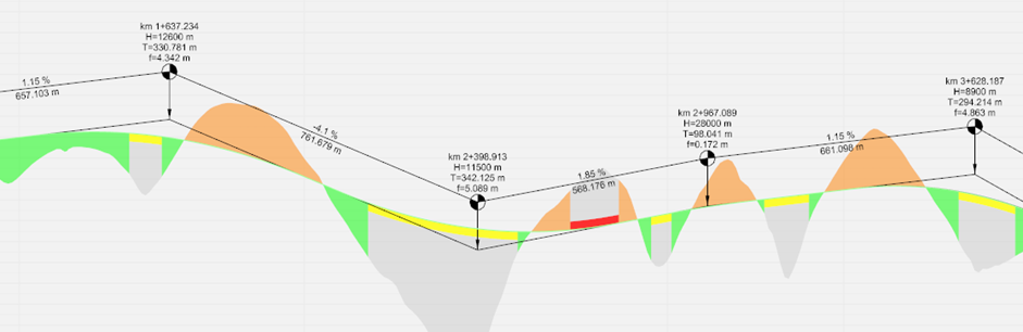 Die Einschnittslage der Konstruktionslinie wird braun und die Dammlage grün dargestellt. In Bauwerksbereichen (Brücke oder Tunnel) werden die Höhendifferenzen zum Gelände hellgrau dargestellt. Darüber hinaus werden Bereiche der Längsneigungen durch Einfärbung der Konstruktionslinie charakterisiert: