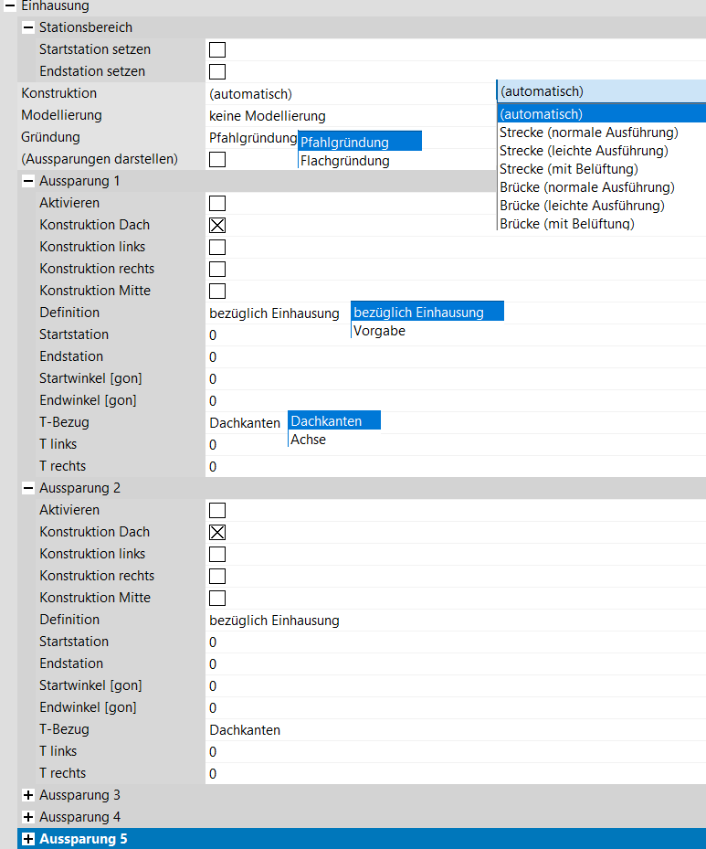Modellierung | Definiert die in der defmod.xml definierte Einhausung für den Stationsbereich. Es können neben Einhausungen auf der freien Strecke auch Einhausungen auf Bauwerken modelliert werden. |