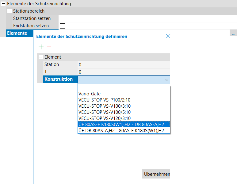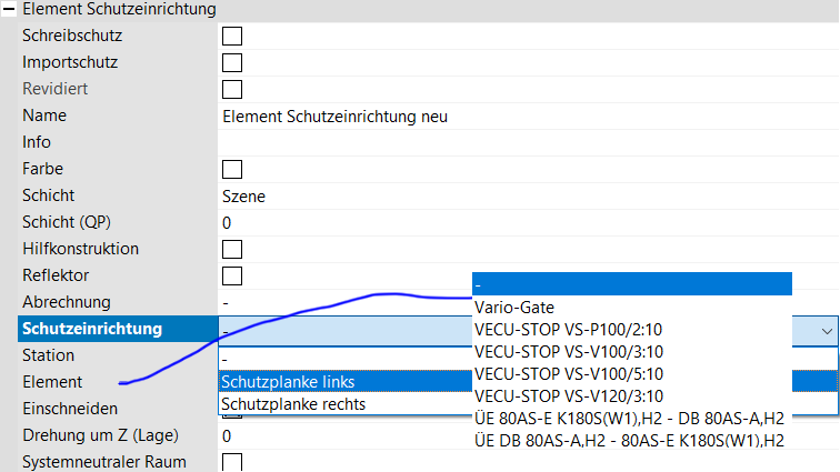 Die Marke “Elemente der Schutzeinrichtung” modelliert für einen definierten Stationsbereich Elemente bzw. Sonderkonstruktionen von Schutzeinrichtungen. Hierfür müssen entsprechende Bauteile im Projekt angemeldet sein.