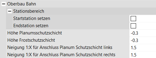 Für diejenigen Stationsbereiche, für die keine separaten Festlegungen in einer etwaigen Marke “Oberbau Bahn” getroffen werden, werden die unten aufgeführten Standardwerte verwendet.