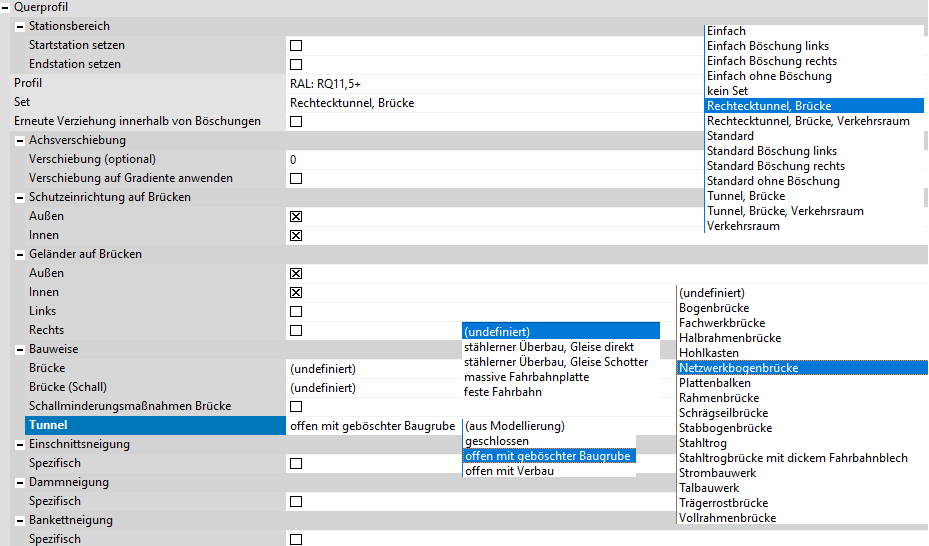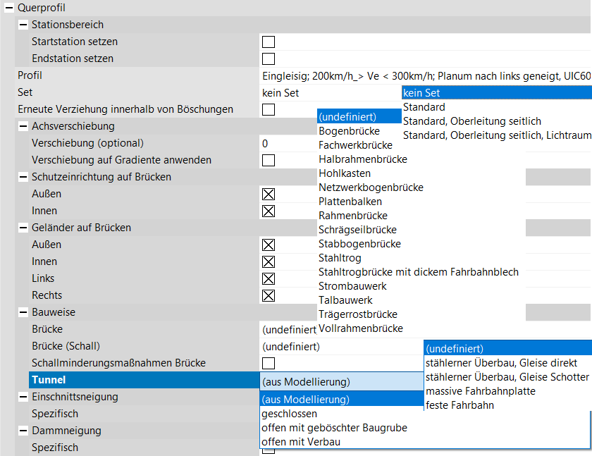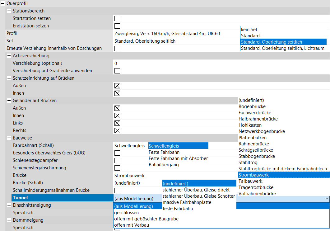 Modellierungsset | Wahl einer Modellierung für ein Querprofil. Je nach Wahl des Regelquerprofils stehen verschiedene Ausführungen zur Verfügung. Ein Modellierungsset verknüpft in einem Querprofil verwendete Bauweisen, Modelle und Träger des Fahrwegs. |