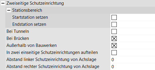 Abstand linker Schutzeinrichtung von Achslage | Definiert den Abstand der linken Schutzeinrichtung zur Achse. Befindet sich die Achse in der Mitte des Mittelstreifens, sind hier in der Regel negative Werte zu wählen. |