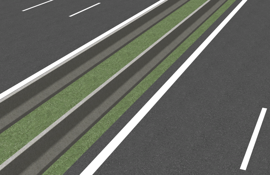 Die Marke “Zweiseitige Schutzeinrichtung” modelliert bei zweibahnigen Straßen Schutzeinrichtung im Mittelstreifen. Der Typ der Schutzeinrichtung kann über die Marke “Typ Schutzeinrichtung” definiert werden.