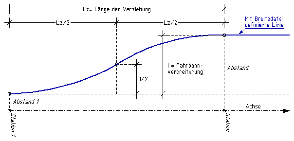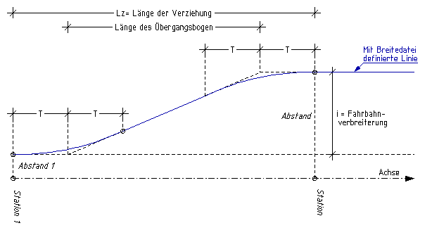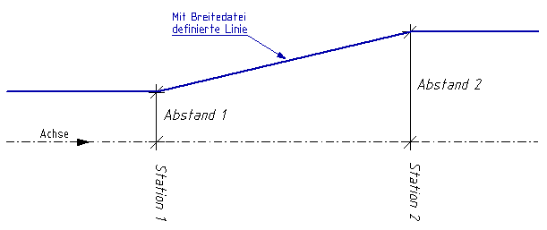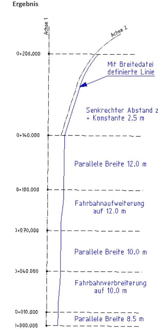 A2 | Es wird der senkrechte Abstand (plus Abstand 1) von der aktuellen Achse zur Parallelen der Achse 2 berechnet. Diese T-Definition ist das Standardverfahren, um Fahrbahnbreiten für Bereiche zu definieren, in denen der Fahrbahnrand als selbstständige Achse konstruiert ist. |