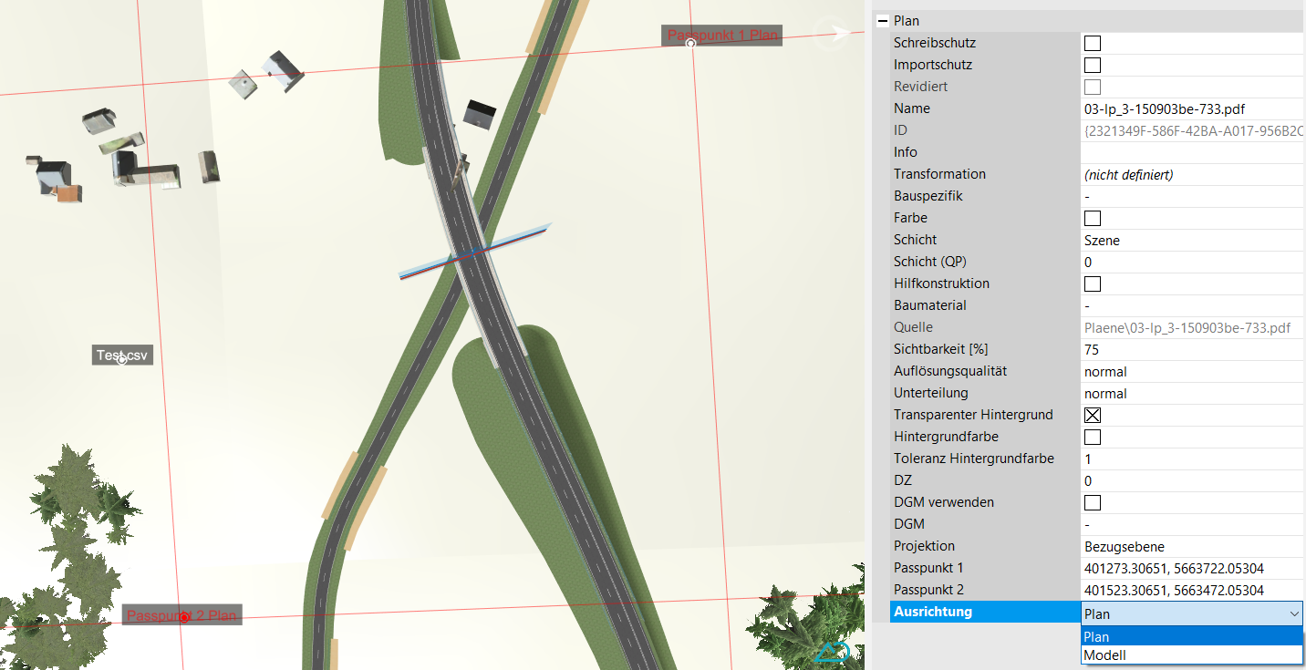 Dazu enthält die Planvorlage im Ansichtsfenster zwei spezielle Passpunkte (“Passpunkt 1” und “Passpunkt 2”), die als Ausrichtungsmerkmal zusätzlich die Option “Plan” oder “Modell” enthalten. Das Umschalten erfolgt über die Leertaste + das Anklicken eines der Passpunkte.