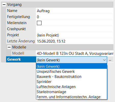 Hier stellen Sie die Art des Fachobjekts (ob es “bleibend” oder “temporär” ist bzw. zu einem “Raum” oder “Rückbau” gehört) und das zugehörige “Gewerk” ein. Je nach Einstellung wird das betreffende Fachobjekt beim Animieren der Vorgänge dauerhaft oder temporär angezeigt.