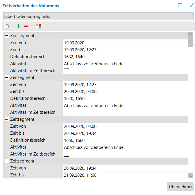 Wenn Sie in den Parametern die Option “Segmentierung” aktiviert haben, erscheint die zeitliche Linie nicht durchgehend, sondern als separate Striche je nach der Anzahl der segmentierten Abschnitte. Diese sind leichter zu verwalten und auszuwerten.