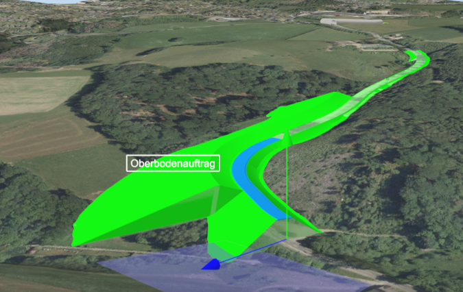 Klicken Sie im Ansichtsfenster auf das farblich markierte Fachobjekt, erscheinen im rechten Eigenschaftsbereich Angaben zu den bis zu dem ausgewählten Zeitpunkt erfolgten Veränderungen am Fachobjekt (z.B. “Auftrags- oder Abtragsvolumen in m3”, “Anteil bereits gebaut in %” etc.)