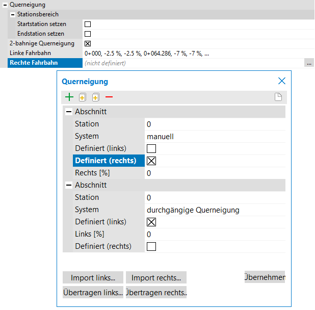 | Rechte Fahrbahn | Über … öffnet sich der Dialog zum Einstellen der betreffenden Fahrbahn. Werte können ebenso importiert bzw. von einer anderen Querneigung übertragen werden. |