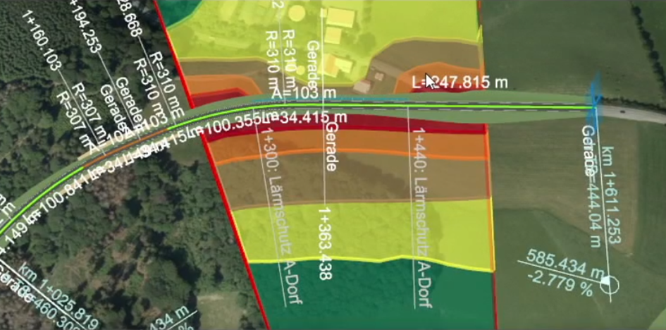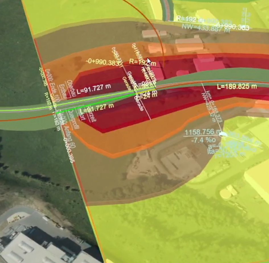Bei längeren Strecken empfiehlt es sich, den Schall abschnittsweise zu berechnen. Die einzelnen Berechnungen können anschließend in einer Kombination zu einer Gesamtkarte zusammengefasst werden.