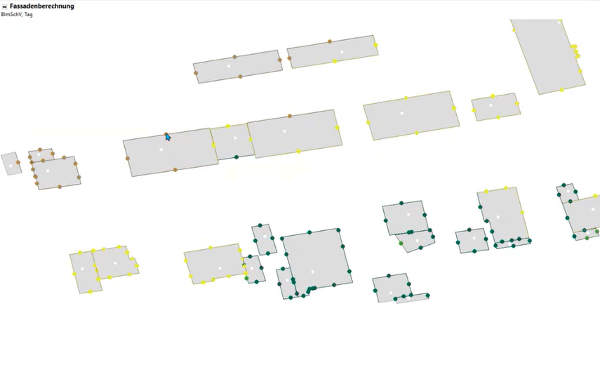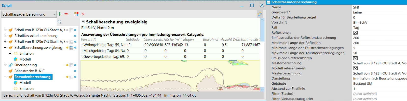 Neben einer rasterförmigen Schallberechnung besteht die Möglichkeit, eine gebäudespezifische Schallfassadenberechnung durchzuführen und anzeigen zu lassen.