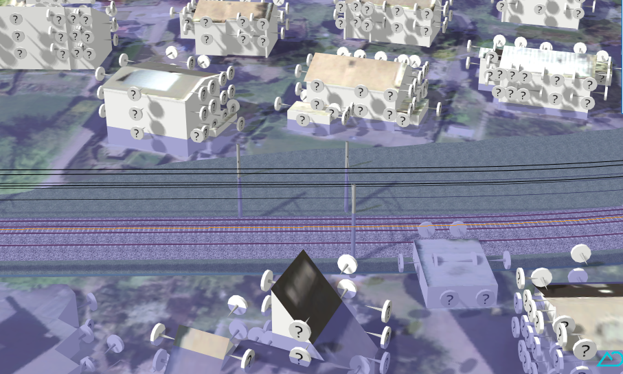 Wählen Sie anschließend im Kontextmenü dieser Berechnung die Option “Fassadenimmissionspunkte erzeugen…” aus. Die Punkte werden in Form von Stecknadeln mit Fragezeichen an den Fassaden der betreffenden Gebäude (unter Berücksichtigung der Breite und Höhe der Fassaden) erstellt und angezeigt.