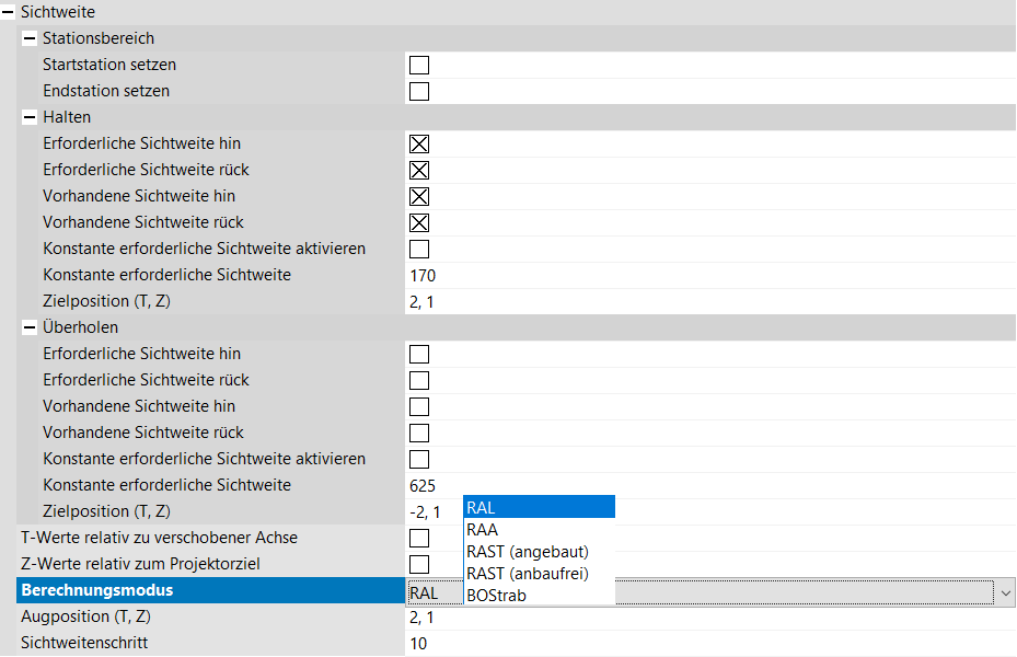 Vorschrift | Vorschrift, nach welcher die Berechnung der nicht konstanten erforderlichen Sichtweiten erfolgen soll. Zur Auswahl stehen momentan RAS-L 1995, RAL 2007 und RAA 2008. |